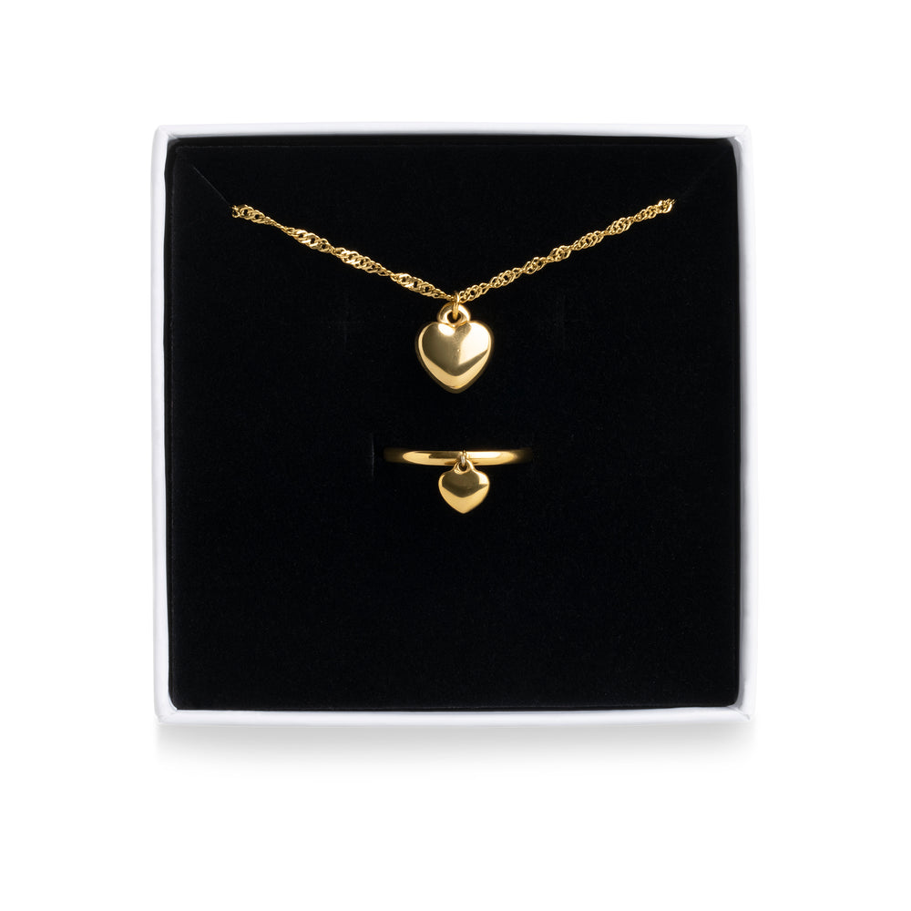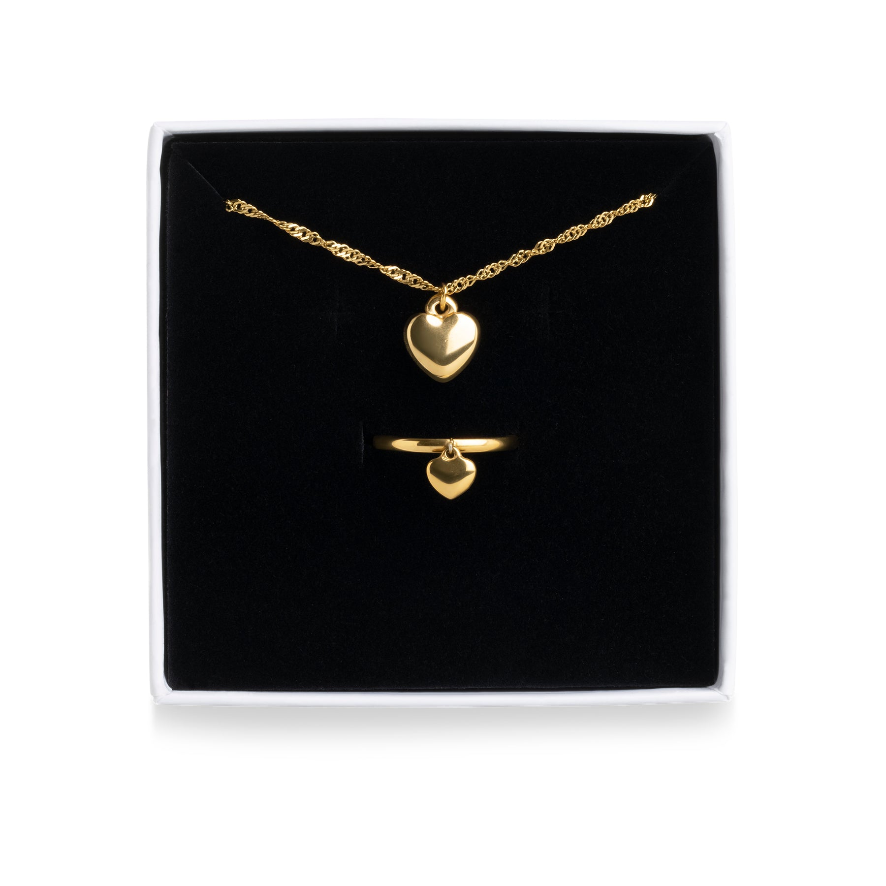 Discover timeless pieces designed to delight — beautifully wrapped, ready to gift, and made to be loved. Crafted in waterproof stainless steel. This gift set contains our Bellamy necklace and Iselin ring. Available in silver & gold.