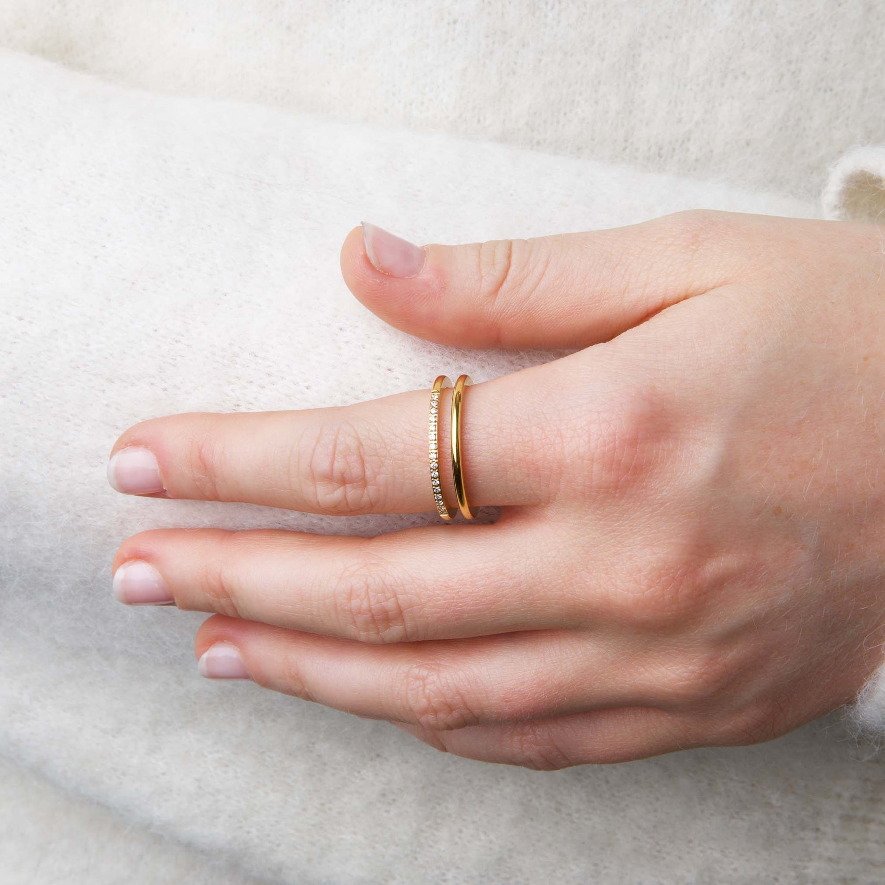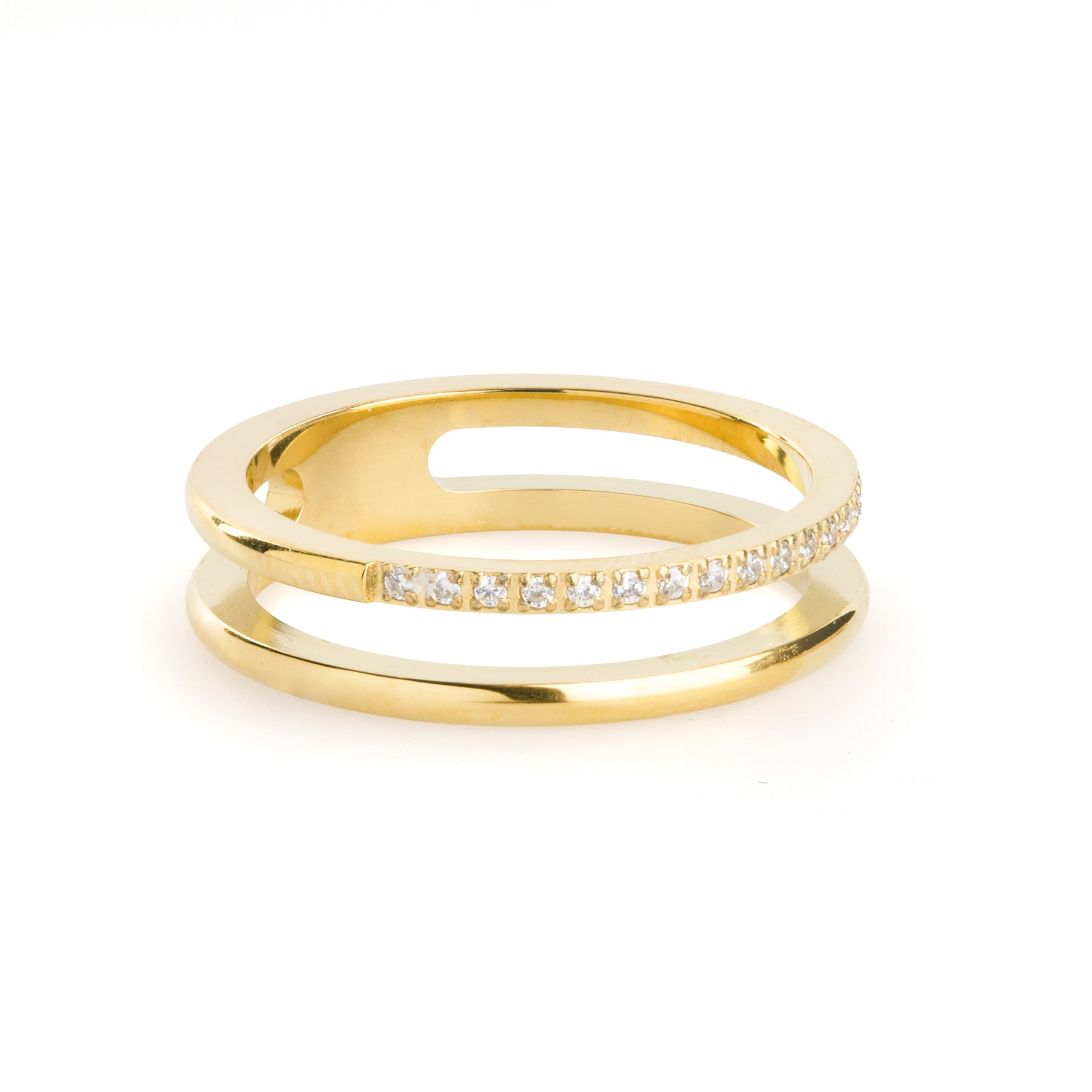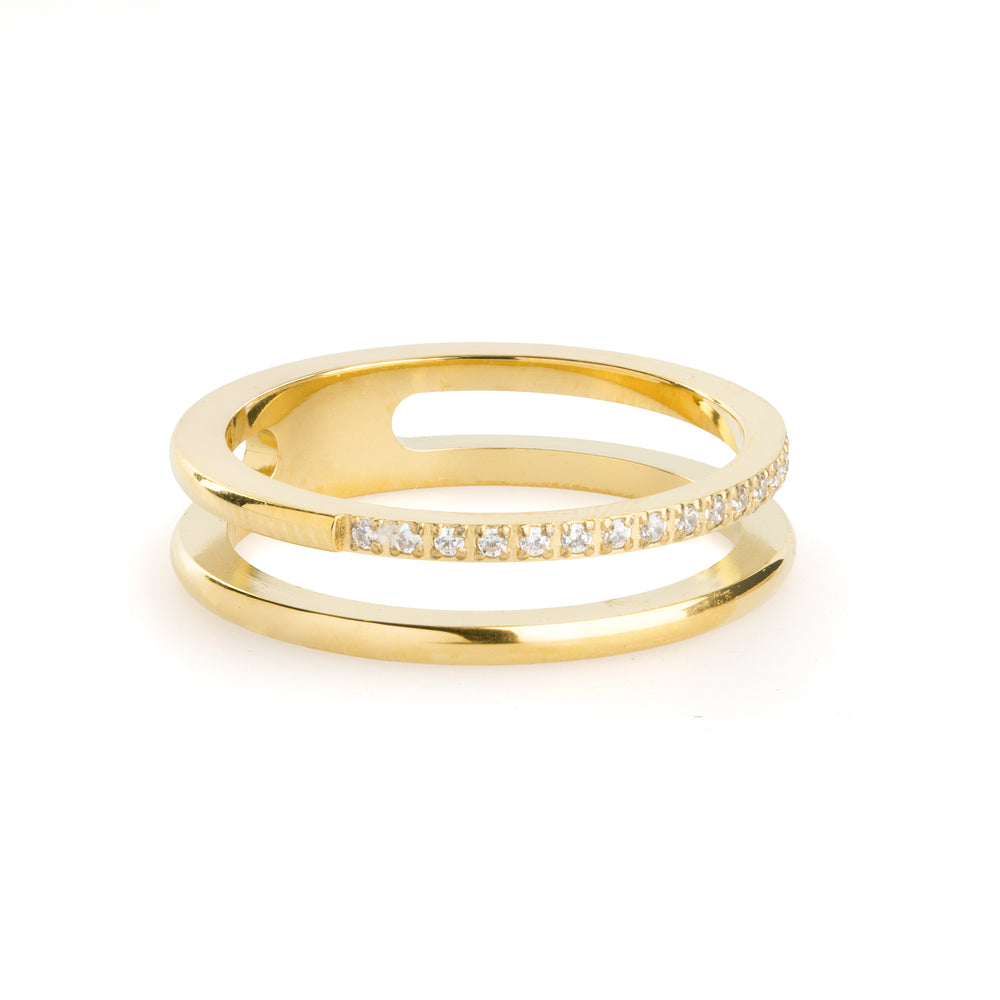 De Melissa-ring is vervaardigd uit waterproof roestvrij staal met een strak ontwerp met dubbele band, geaccentueerd door delicate kristallen. Verkrijgbaar in zilver en 18k goud plating – modern, elegant en gemakkelijk dagelijks te dragen.